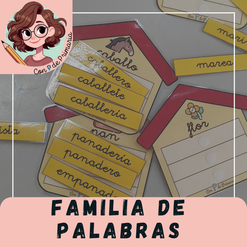 Incluye diferentes categorías con 3 palabras de dicha familia. En el ático de la casa, se ve una imagen que engloba la palabra raíz.