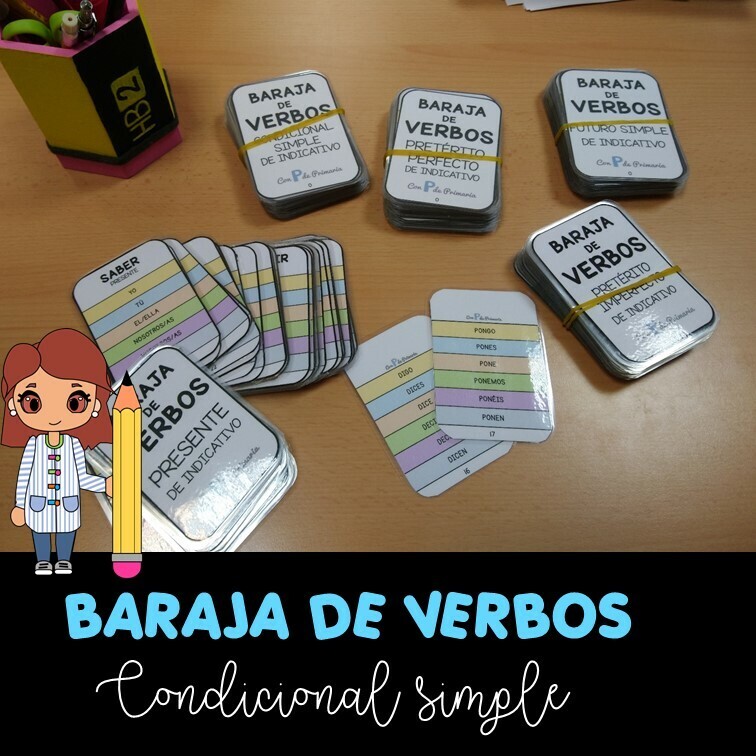 44 Cartas de doble cara con las conjugaciones de 44 verbos en Condicional simple de Indicativo.