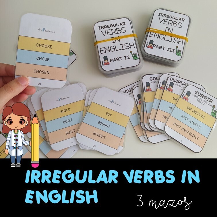 3 barajas de cartas de doble cara con las conjugaciones de los145 verbos irregulares en inglés. Se da el verbo en español, y por detrás aparece el infinitivo, el pasado simple y el participio.